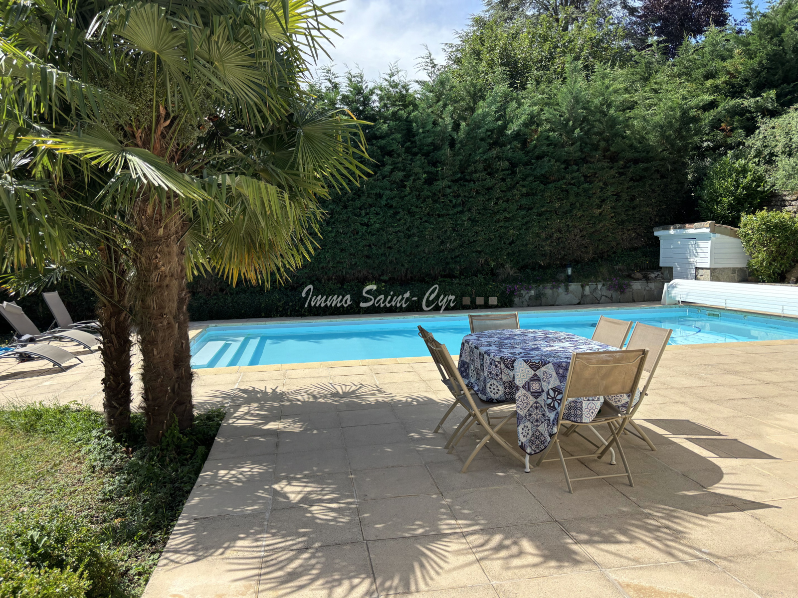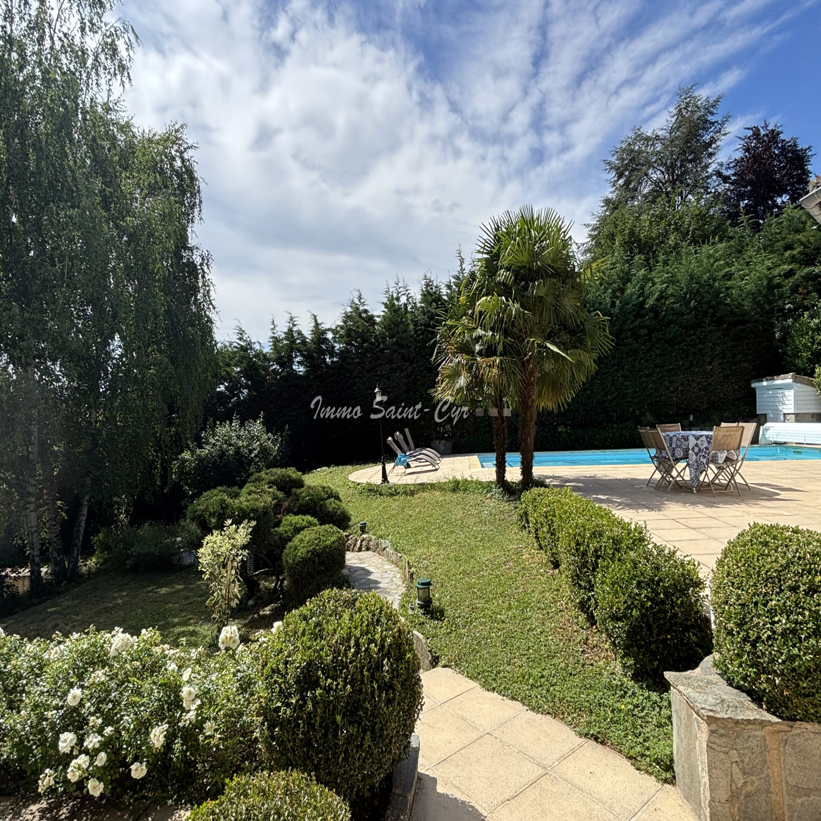 Un joli jardin clos et paysagé de 1 500 m² avec sa piscine exposé plein sud.